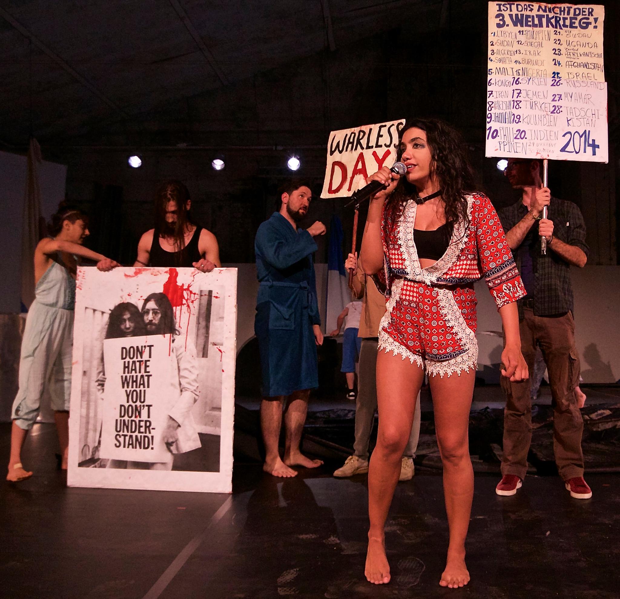 Flüchtlingserwachen in Köln? In Fleshmob mit Toten kooperiert bodytalk mit warless day. An wie viele Tage ohne Krieg können wir uns erinnern? Mit 21 Jahren ist Solmaz Vakilpour aus dem Iran geflohen und lebt seit zehn Jahren in Köln. Im letzten Jahr hat sie dort die Friedensbewegung warless day gegründet, mit der sie Happenings gestaltet, um im öffentlichen Raum nackt gegen den Krieg zu protestieren. Fleshmob mit Toten fragt anhand der Biografie von Solmaz Vakilpour, was eine Tanz-Compagnie mit einer Friedensbewegung verbindet - und was nicht. Was können wir als ExpertInnen für Bewegung, als politische Körper tun, jetzt wo das Flüchtlingserwachen in Köln angekommen ist?